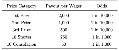 Various countries offers different prize payout structure, but the odds remains the same, 1 of 10,000; 0000 - 9999.