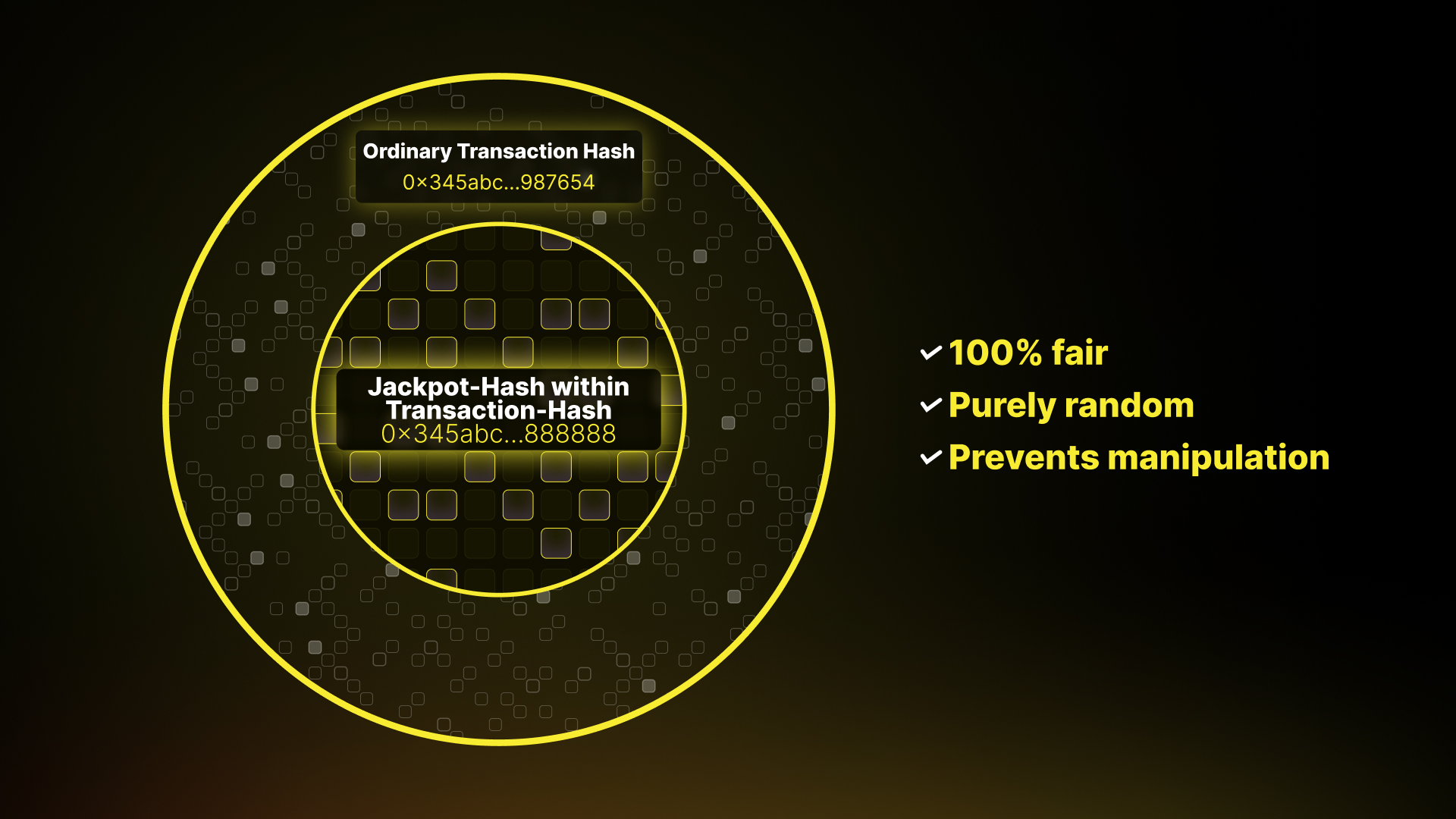 In order to create a pure random hash that canโt be manipulated, Fuyo leverages the existing cryptocurrency technology, aka โjackpot-hash within transaction hashโ. This hash is a 32-bytes hexadecimal similar to transaction id (transaction hash).